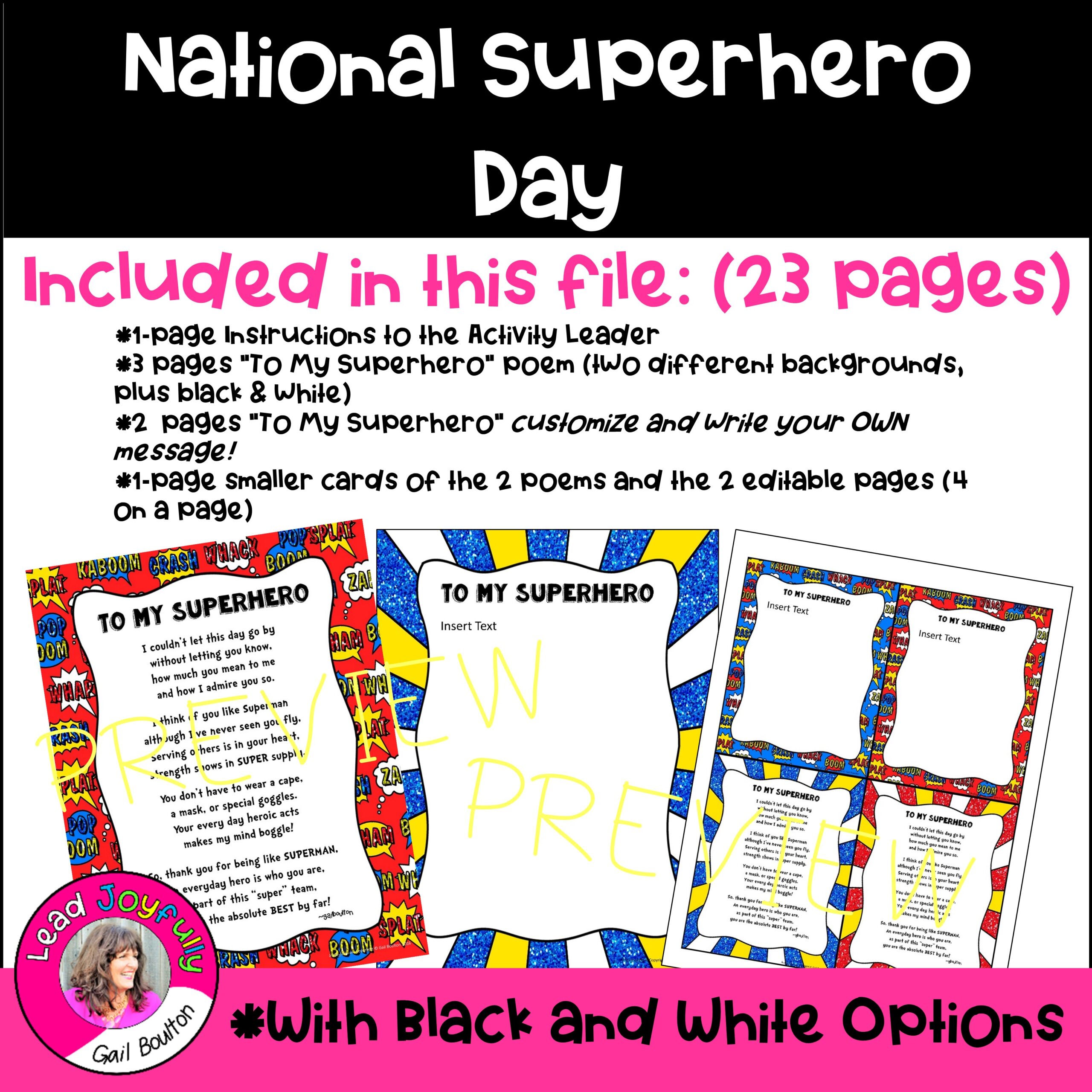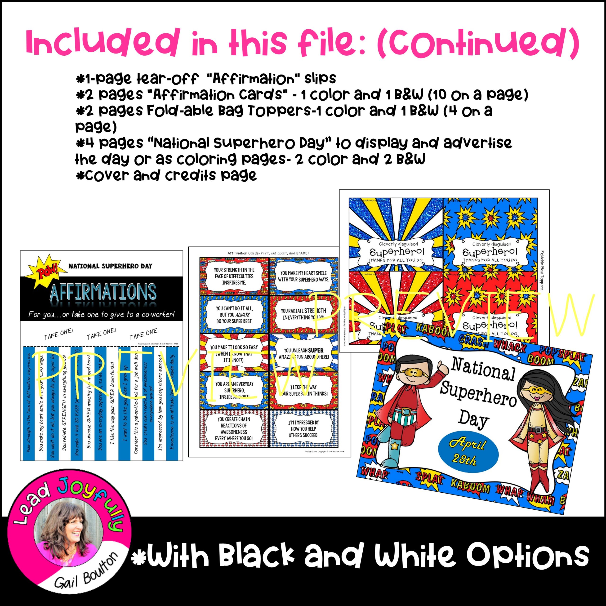 *4 pages “National Superhero Day” to display and advertise the day or as coloring pages- 2 color and 2 B&W